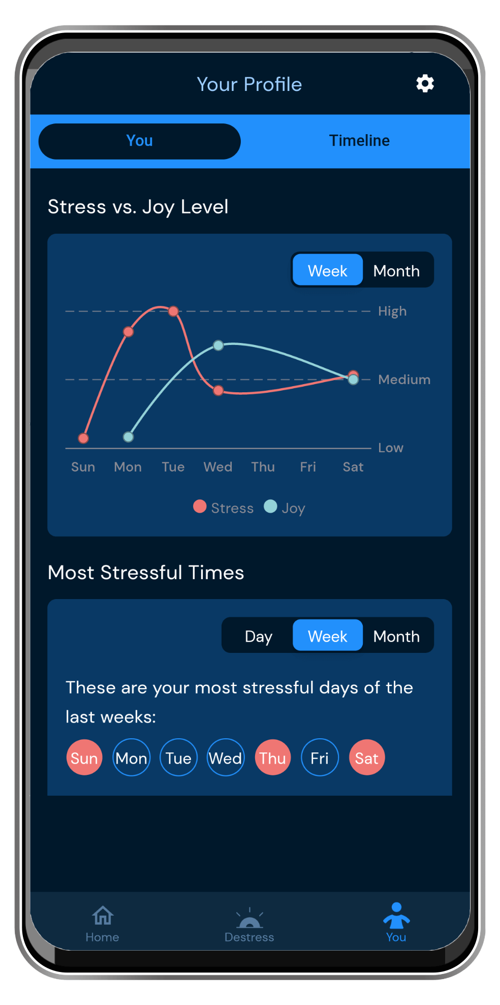 To help you track and visualize your progress we have created a range of metrics for you. You can view metrics on the home screen as well as on by tapping the āyouā tap at the bottom navigation. Some metrics are only available with Stressbuoy premium.